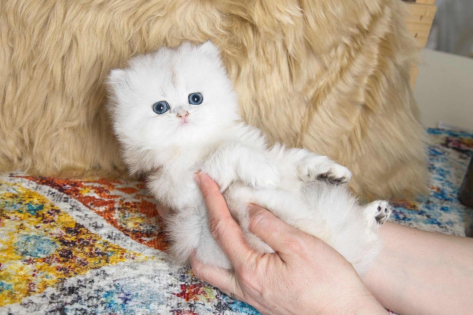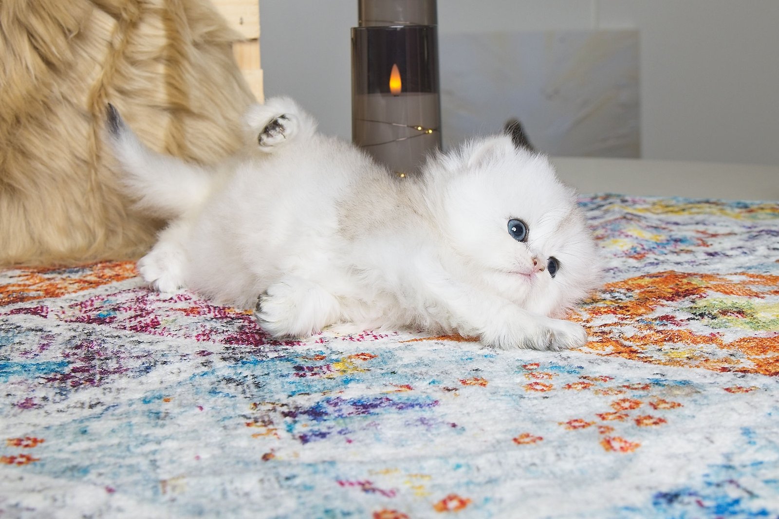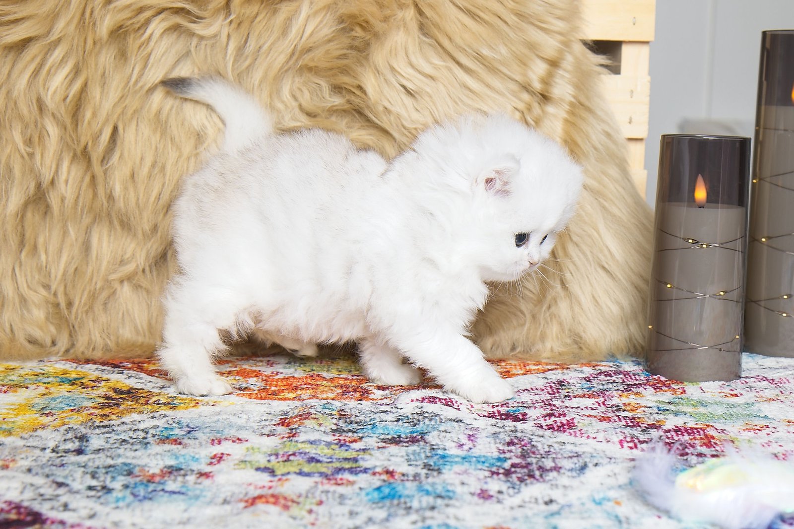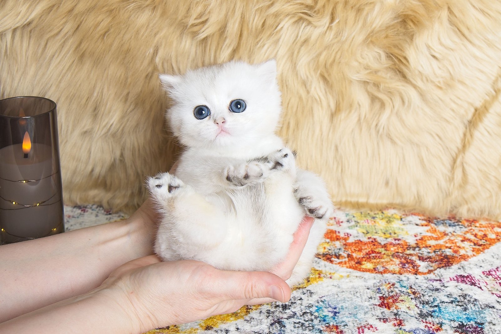 Luca Blue is a silver point with beautiful blue eyes, small ears, round eyes, and a perfectly rounded head. He is an excellent representative of the breed, with the potential to participate in shows or become a valuable breeding cat.