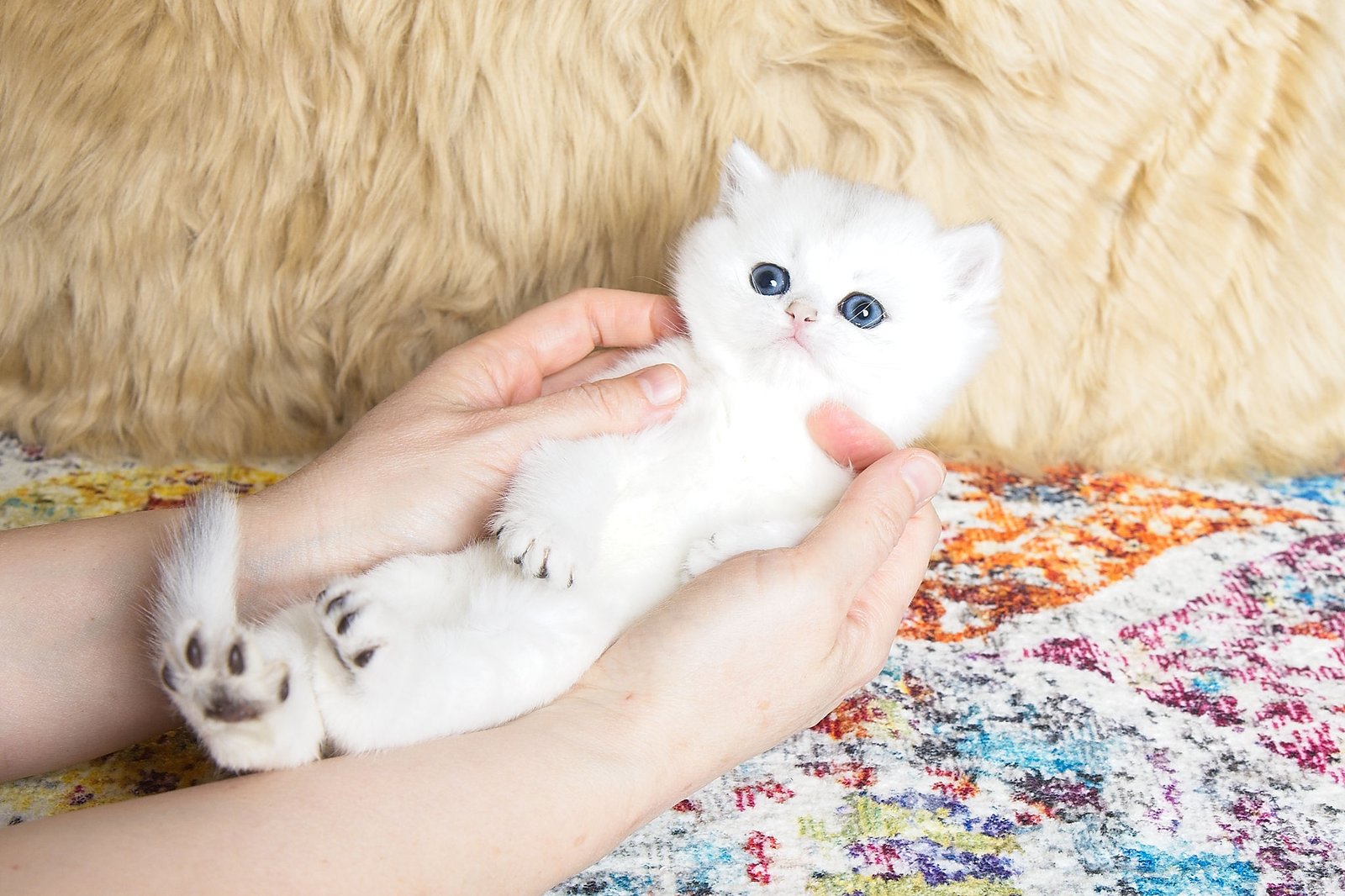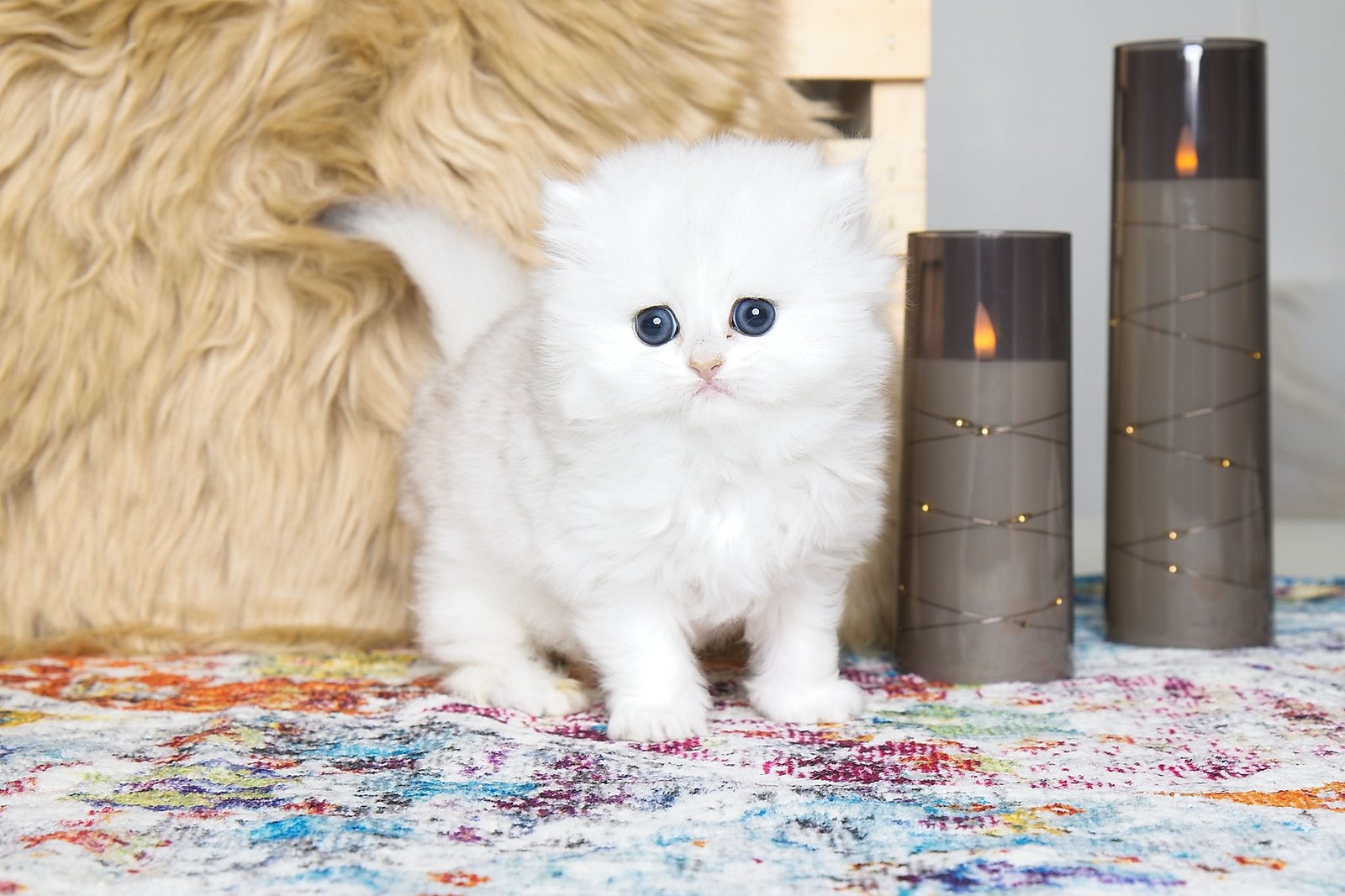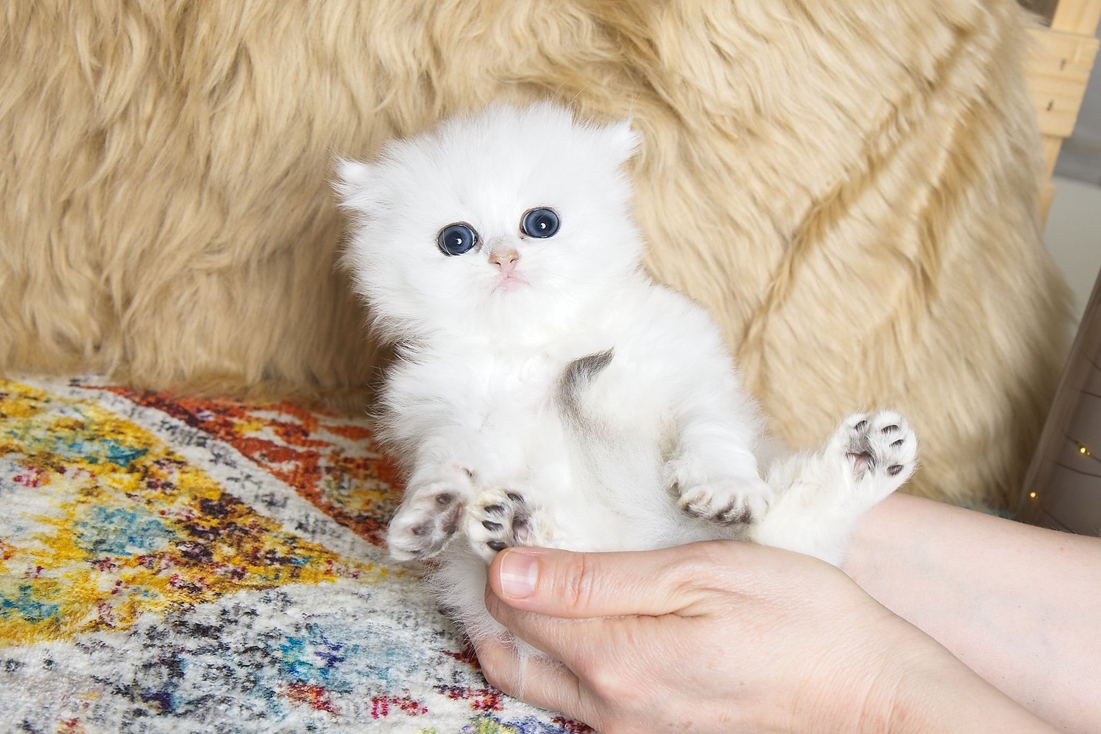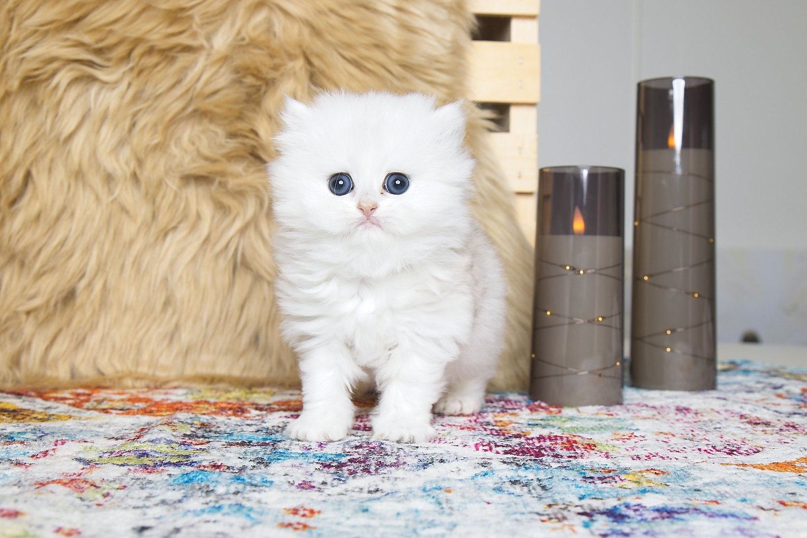 Luca Blue is a silver point with beautiful blue eyes, small ears, round eyes, and a perfectly rounded head. He is an excellent representative of the breed, with the potential to participate in shows or become a valuable breeding cat.